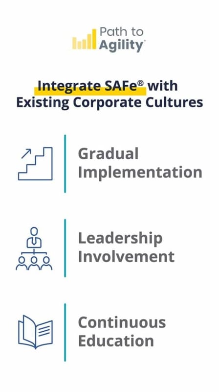 Adopting SAFe within an established corporate environment requires careful consideration of the existing cultural elements, including gradual implementation, leadership involvement, and continuous education.